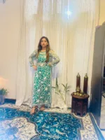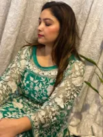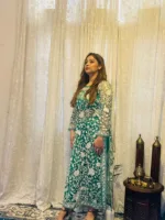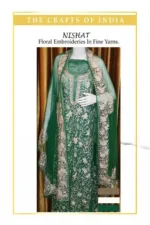 This tulle unstitched kurti in deep green colour is embroidered with white resham threads with maple (chinar) and bootidar patterns in front and back both. Same embroidery patterns runs along the four borders of odhani. It comes with unstitched bottoms.