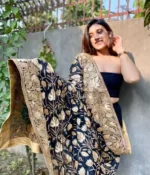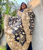 This fine crepe heavy embroidered odhani in black is adorned with heavy tilla (metallic) threads along the four side borders and heavy jaal in the center highlighting maple (chinar) leaves.