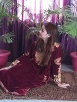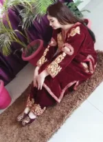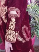 This winter wrap (pheran ) in maroon velvets is heavy embroidered (zardozi tilla ) in gold metallic threads along the neckline , sleeves (cut from the middle section ) and panel and side- pocket. Motifs also embroidered at the back. It comes with same coloured bottoms which is also embroidered. It is paired with matching juttis .