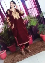Heavy embroidered pheran-salwar with mojis in maroon velvets