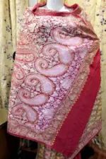 This georgette saree is heavy embroidered making full jaal in chinar, maple, bootidar and geometrical patterns all over in colourful, subtle and bright palette in resham and tilla (metallic threads). Huge paisley motifs on the pallu with elegant borders. It comes with the blouse piece.