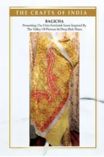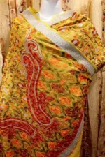 This georgette saree is heavy embroidered making full jaal in chinar, maple, bootidar and geometrical patterns all over in colourful, subtle and bright palette in resham and tilla (metallic threads). Huge paisley motifs on the pallu with elegant borders. It comes with the blouse piece.