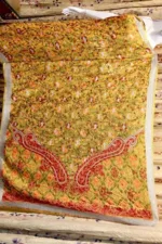 Aari is the most quintessential embroidery created in fine concentric rings of chain stitch using a long hooked needle called the crewel. It is a very fine work that involves elaborate, intricate floral and geometrical motifs. Single stitch style is considered to be the signature style of this embroidery.