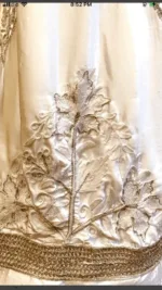 This fully stitched lehenga in deep ivory has a fine detailing of metallic threads (tilla) at the border. The unstitched upper crochet (blouse) is embroidered with white Aari threads and tilla border. Odhani is also heavily embroidered with Aari threads and huge paisley metallic threads at the two ends.
