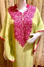 This fully stitched kaftan in subtle , neon and bright shades with kashida embroidery along the neck and a small booti at the back , borders around the neck , side and lower panels are in fine satins.