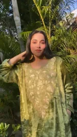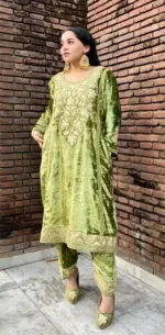This phiran in pure makhmals in pista green is heavy embroidered in gold-silver metallic threads (zardozi tilla)along the neck -front and back , sleeves and panel . It comes with same-coloured salwar. The inclusion of matching shoes enhance overall look of the product.