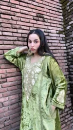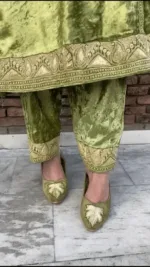 Heavy Embroidered Pure Makhmal Pista Green Phiran-Salwar and Shoes