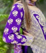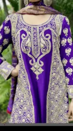This pure crepe heavy embroidered kurti in bright purple all over front and back is adorned with heavy tilla (metallic and resham threads). Bottoms is also heavy embroidered. It comes with odhani.