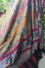 Pure Pashmina heavy hand embroidered shawl in multi – coloured threads in ‘Aab’ ( water ) and ‘Dar’( flowing ) and ‘Bootidar’patterns with handwoven borders.