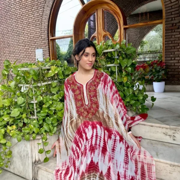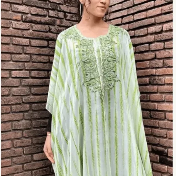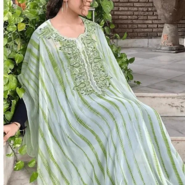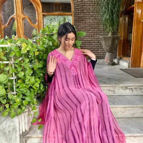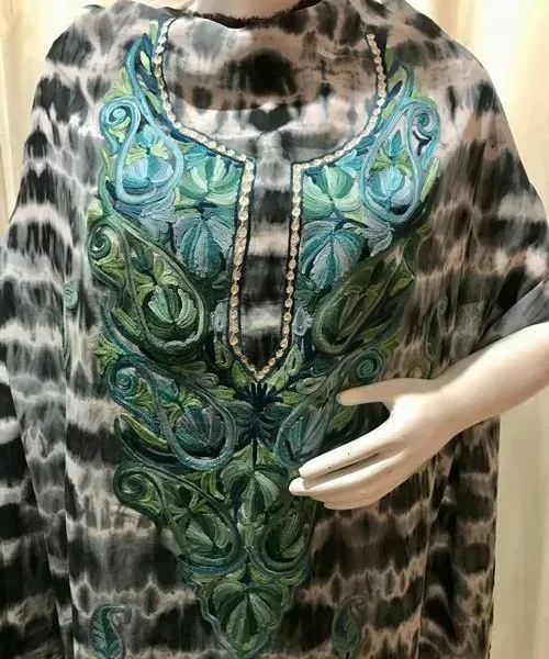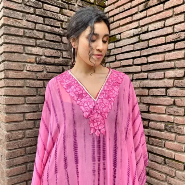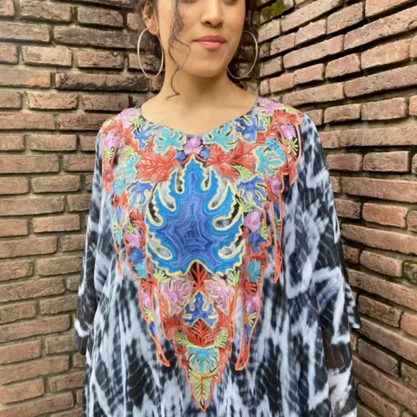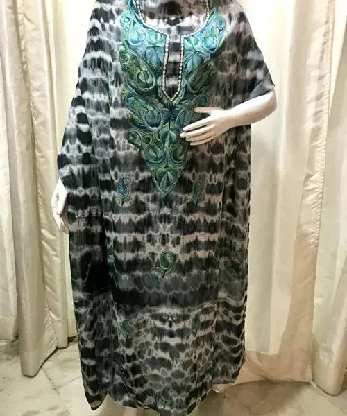 This tie-dye fully stitched kaftan in fine georgettes in diverse colour palette is intricately embroidered around the neck and in various combinations of threads (Aari) in bright and vibrant hues.