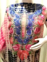 This tie-dye stitched kaftan in georgettes in diverse colour palette is intricately embroidered around the neck and in various combinations of threads (Aari) in bright and vibrant hues. A small floral motif is engrossed on the back also.
