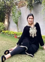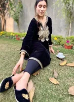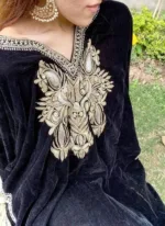 This winter wrap (phiran)in velvets is heavy embroidered in metallic threads (Heavy Tilla) along the neckline, sleeves and panel. Motifs also embroidered at the back. It also comes with matching juttis.