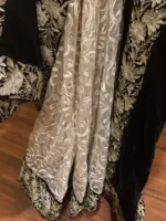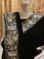 This black and white velvet-tulle saree is heavy embroidered along the borders with aari-tilla (metallic threads). It comes with the velvet doshala which is also heavy embroidered along the four borders.