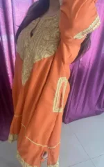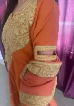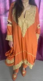 This winter wrap (pheran ) in deep Peach Pashmina is heavy embroidered (zardozi tilla) in gold metallic threads along the neckline, sleeves (cut from the middle section) and panel and side pockets . Motifs also embroidered at the back. It comes with same coloured bottoms which is also embroidered. It is paired with matching potli and jutti also.