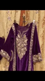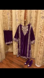 This winter wrap (pheran ) in purple velvets is heavy embroidered (zardozi tilla) in gold-silver metallic threads along the neckline , sleeves , panel and two side pockets (front and back both ) . Thick panels also runs along the shoulders. It comes with same coloured bottoms (salwar) and matching shoes.